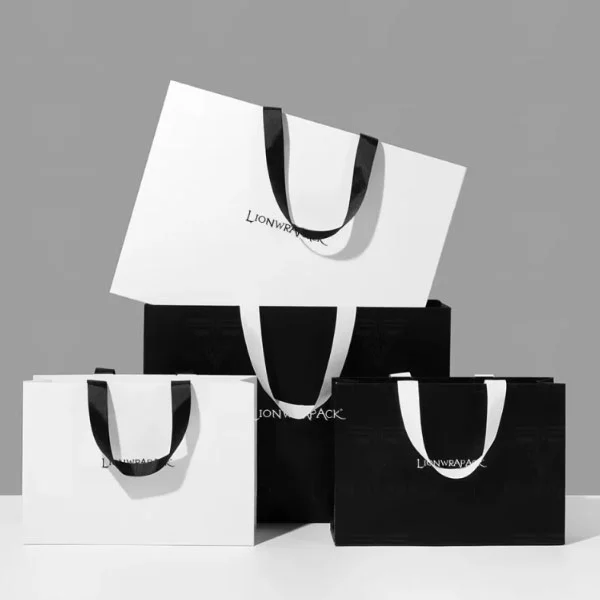 Печатная роскошная бумажная пакет роскошные подарочные бумажные пакеты с логотипом логотип логотип сумки для покупок. Этот элегантный черно-белый бумажный пакет сочетает в себе минималистскую эстетику с премиальной текстурой, что делает его идеальным для роскошных брендов, розничных магазинов, подарочной упаковки и бутиков. Обладая широкими ленточными ручками и усиленной конструкцией, он обеспечивает как красоту, так и силу в презентации.